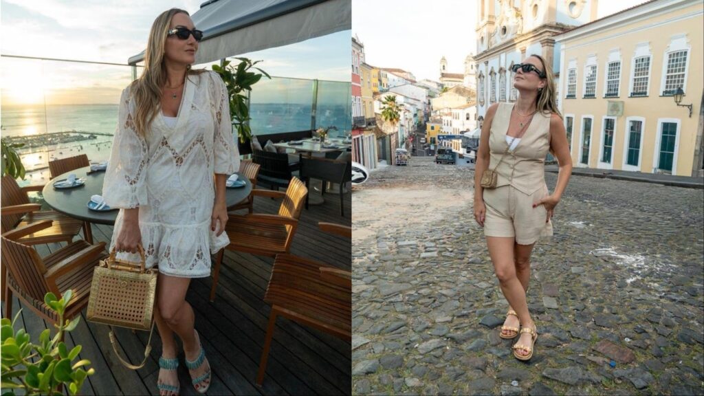 Para os looks, a empresária diz que a dica é utilizar roupas leves e elegantes. Um dos exemplos é um conjunto na cor azul composto por uma saia mais curta e uma blusa sem alça e assimétrica. Já outro conjunto, na cor bege, une um short com um colete com botões.